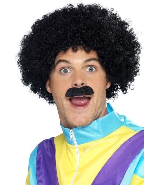 Black curly wig and black moustache