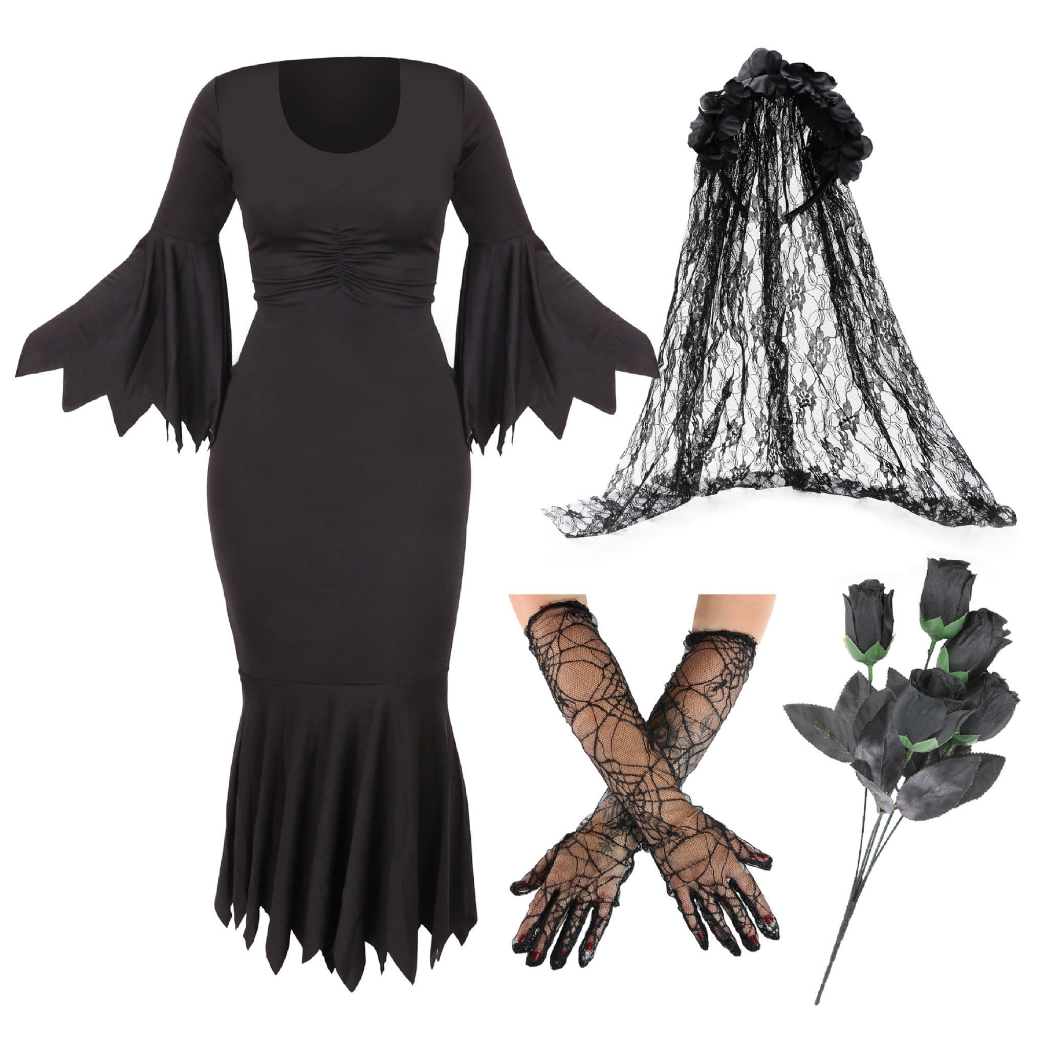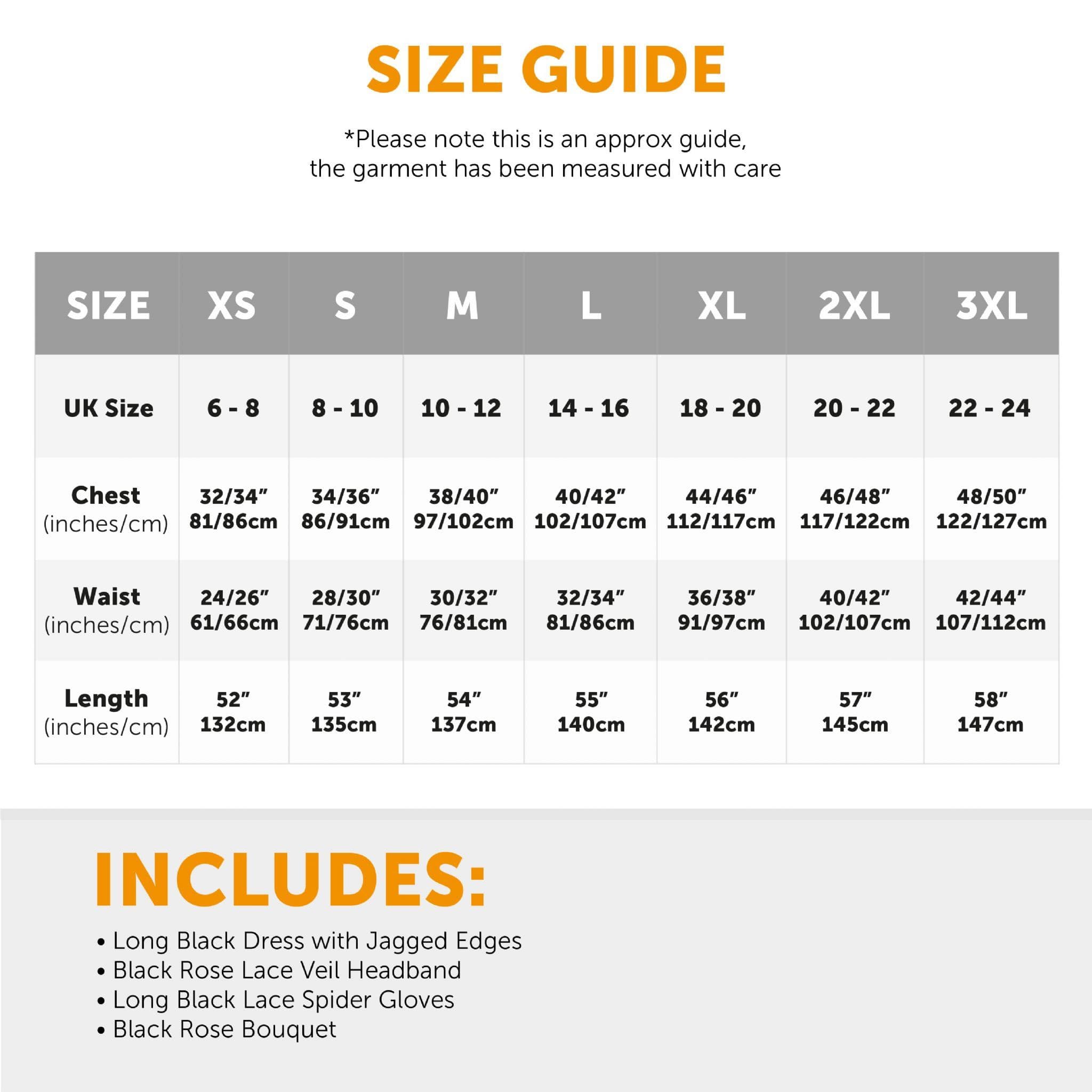 COSTUME INCLUDES: Your Ladies Bride of Darkness Dress is a long Black Dress with tattered edges, a Long Black Lace Veil with a Rose detailed Headband, a pair of elegant, long Black Gloves with a lace design, styled into a Spiderweb pattern all over, and a Black Rose Bouquet, the perfect look for any fancy dress event!