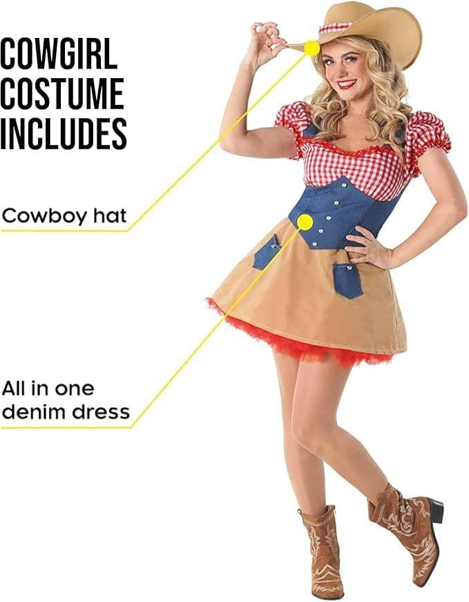 Cowgirl costume - this one dress is made three parts, which include: a red and white gingham patterned top and sleeves, button up denim middle, and cow hide style attached skirt. Also includes hat. Please note the dress is quite short.