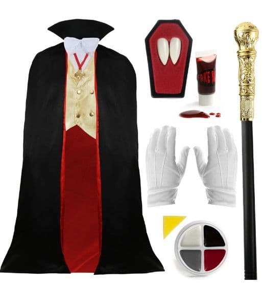 COSTUME INCLUDES: Your Men’s Vampire Costume includes a Gold Waistcoat with White Shirt, a Gold Medal on a Red Ribbon Necklace, a White Bow Tie, a Black Collared Cape with a Red interior, Vampire Fangs with Adhesive Dental Putty, a 3 Piece Cane with a Gold Detailed Top, White Gloves, and a palette of Face and Body Paint with White, Black, Grey and Red colours, and a Tube of Fake Blood!