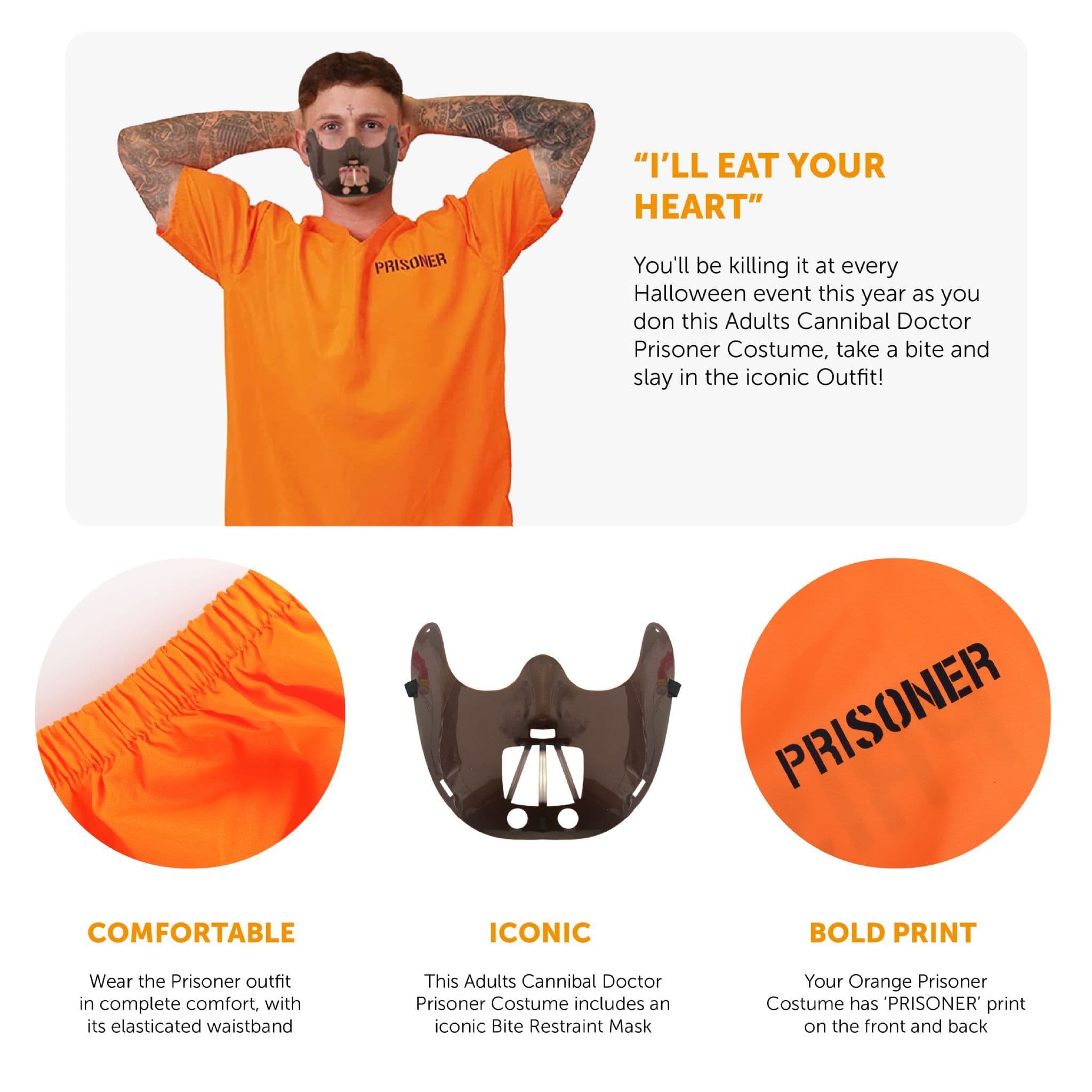 COSTUME INCLUDES: This Adults Cannibal Doctor Prisoner Costume includes an Orange Prisoner Convict Top with a bold ‘PRISONER’ print on the front and back with matching Trousers that have an elasticated waistband, Silver Metal Handcuffs with a Key and an iconic Brown Bite Restraint Mask, the perfect Costume this Halloween!